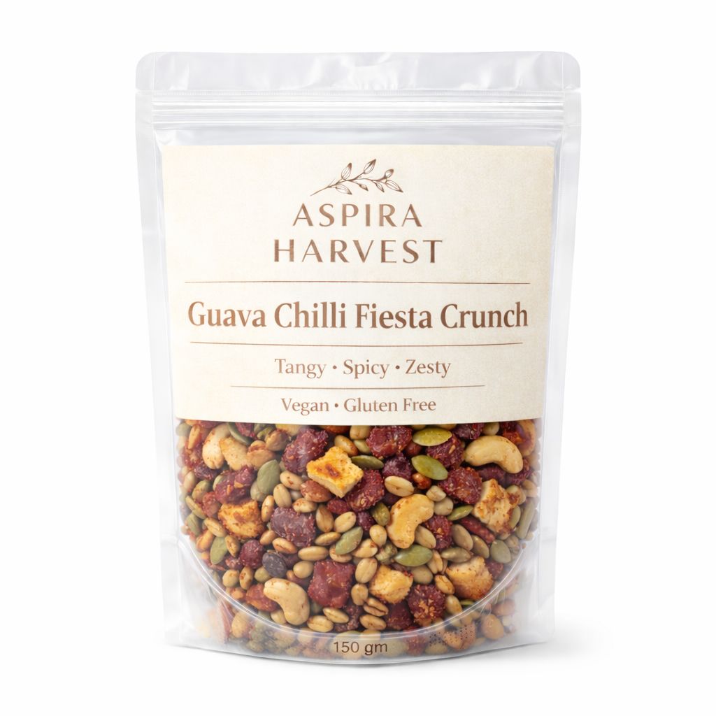 Guava Chilli Fiesta Crunch combines dried guava bites, seeds and nuts with a gentle chilli kick creating an irresistible balance of tangy, fruity and zesty notes. Perfect for those who love bold, modern flavors. Crafted in small batches for peak freshness.